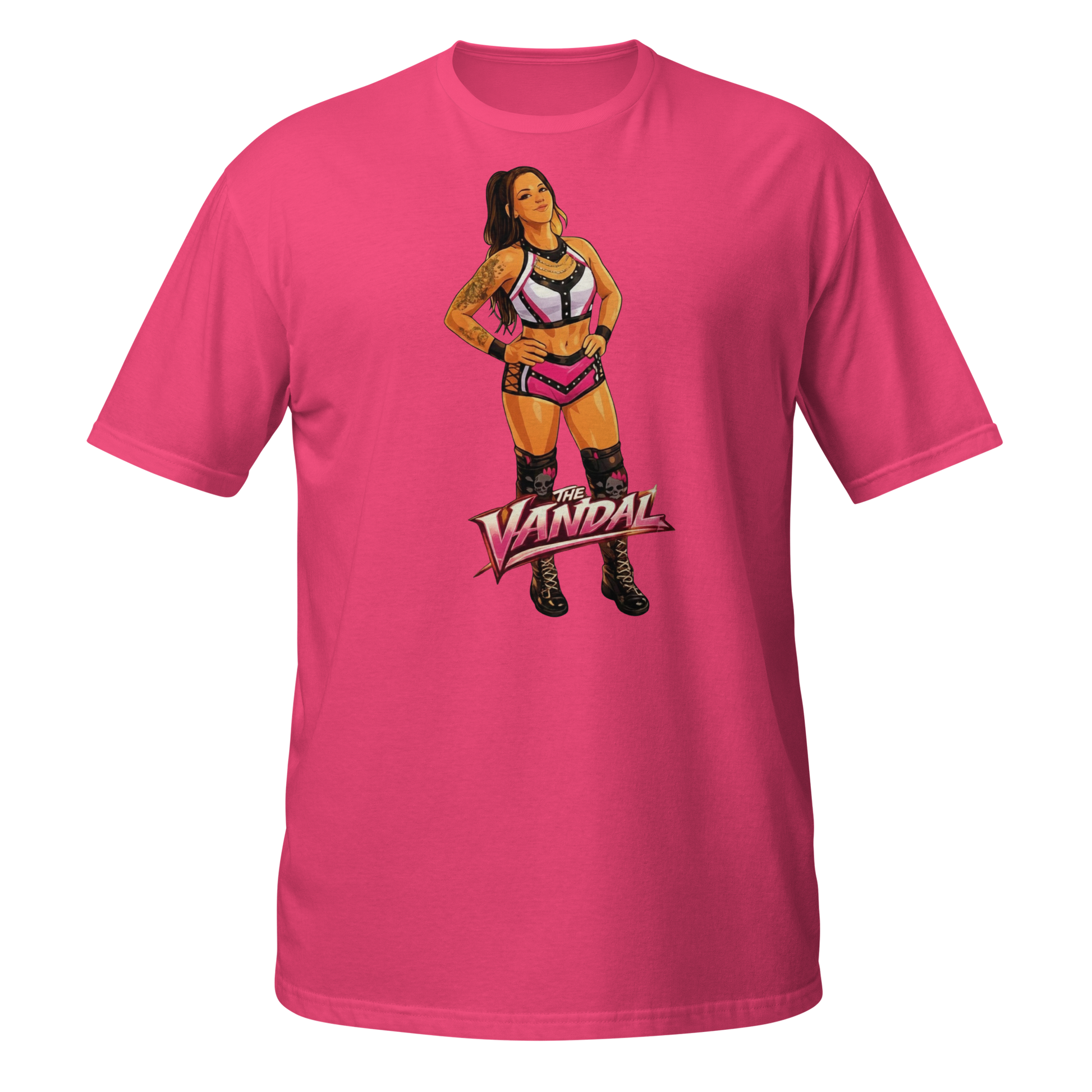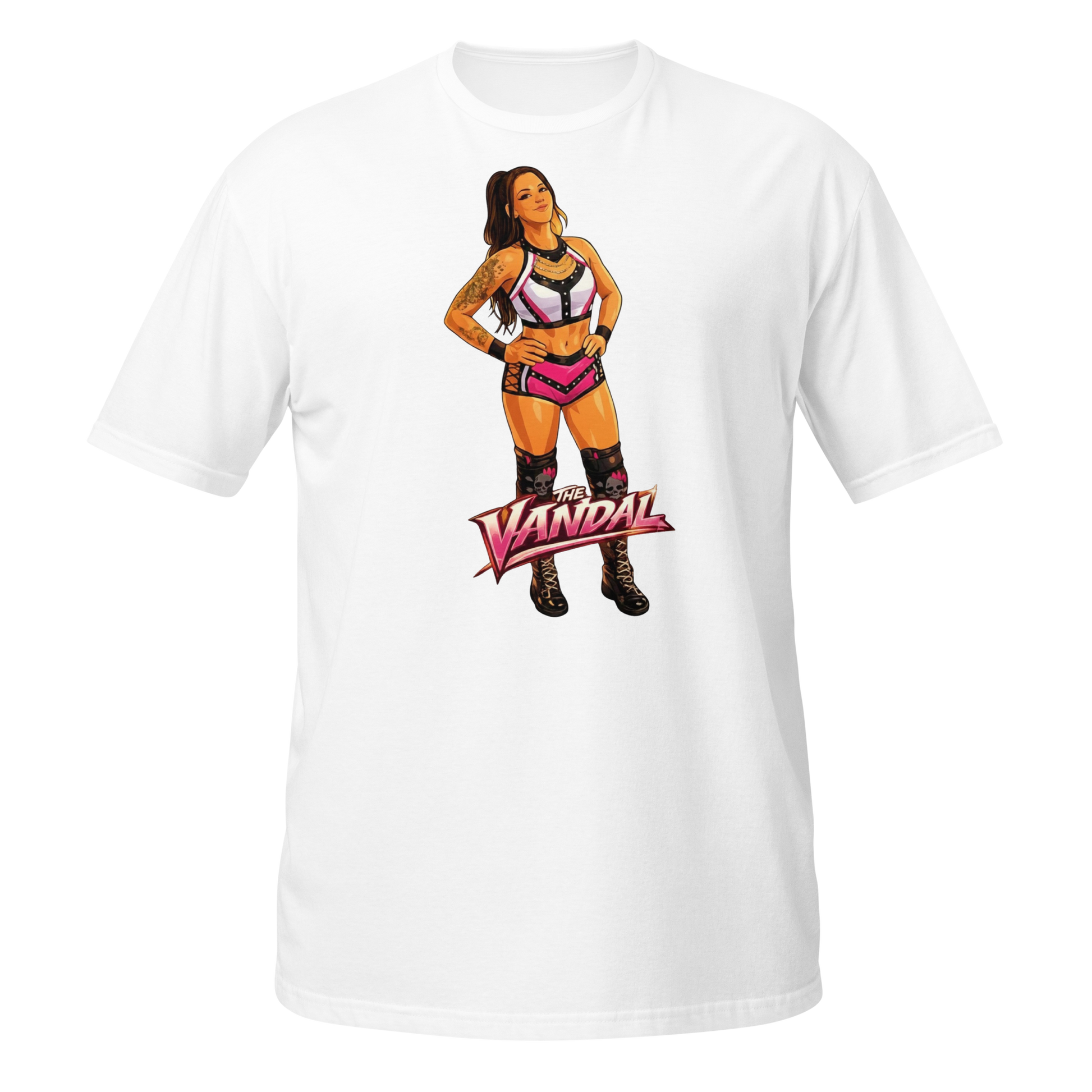 Chaos never looked so good. Represent one of the most vibrant and dangerous forces in the ring with the official "The Vandal" Chantal ladies' tee. This design showcases Chantal in her iconic pink and black aesthetic, complete with her signature skull-motif gear and unrelenting attitude.