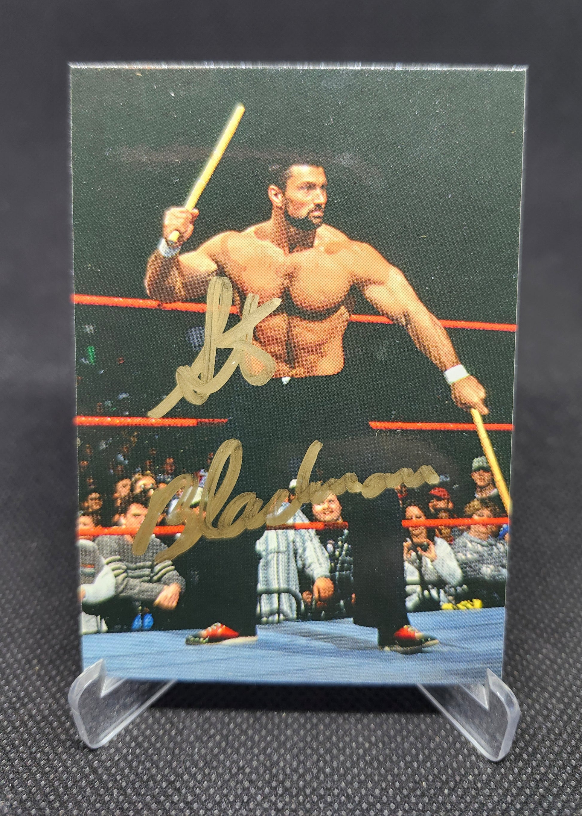 Step into the Attitude Era with "The Lethal Weapon!" This rare, authentic autographed card comes from the 1998 DuoCards World Wrestling Federation SuperStarz series. It features a young Steve Blackman ready for combat with his signature eskrima sticks.
